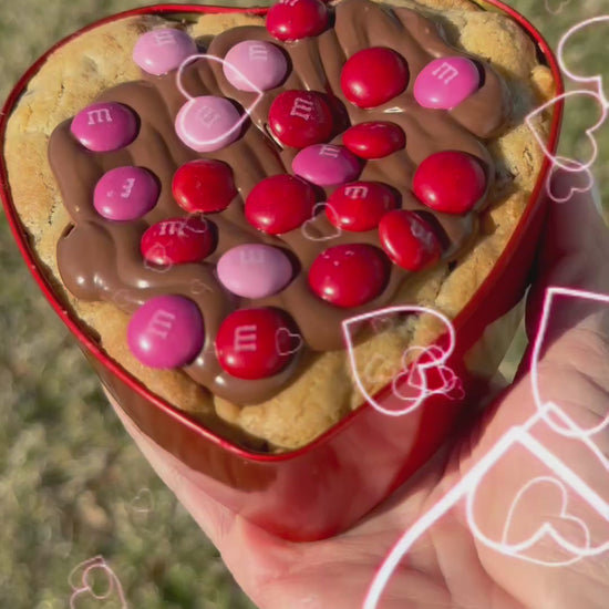 Delicious chocolate chip cookie stuffed with a fudgy homemade brownie and Nutella, topped with more Nutella and Milk Chocolate m&m’s presented in a heart shaped tin.